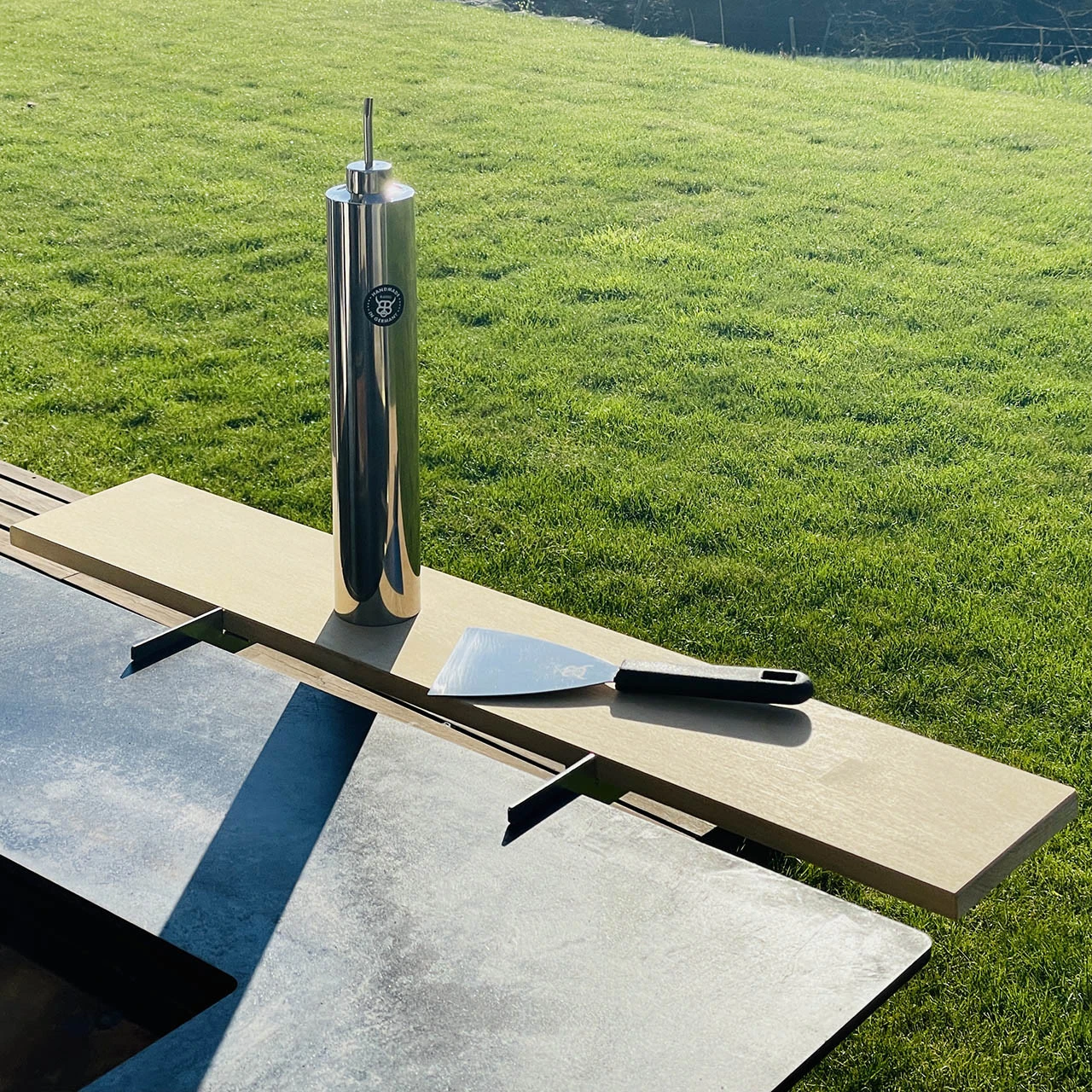 BlackBulls Ablagebrett ist das perfekte Zubehör für Ihren BigQube. Es besteht aus dem wetterfesten Garapa-Holz, welches sich unter Anderem durch eine besondere Langlebigkeit auszeichnet. Das Brett ist mit einer Länge von 80 cm und einer Breite von 14 cm eine perfekte Möglichkeit, um mehr Ablageflächen zu schaffen. Mit den Edelstahlhalterungen kann es leicht an die Grillplatte angesteckt werden. Darüber hinaus hat man mit dem Ablagebrett auch einen Schutz vor der heißen Grillplatte.