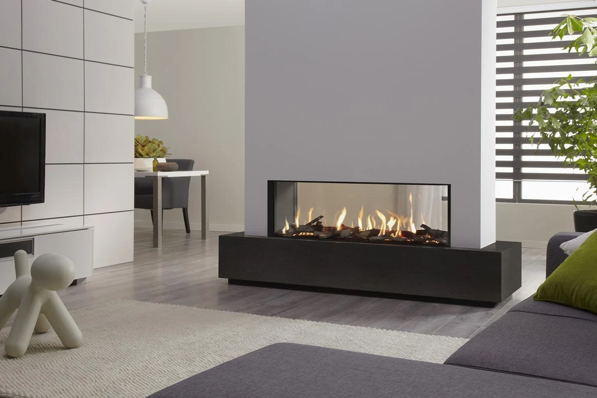 Gaskamin Metro 130XT-41 Tunnel von Hersteller Dru – beidseitiger Blick auf das Feuer durch effektvollen Raumteiler