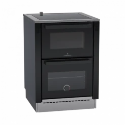 Ein Holzherd, wie man ihn noch nie zuvor gesehen hat. Hier werden traditionelle Werte zeitgemäß interpretiert. Modern, mit mattem Schwarz, Hochglanz Glasfronten und klarer, gerader Linienführung.