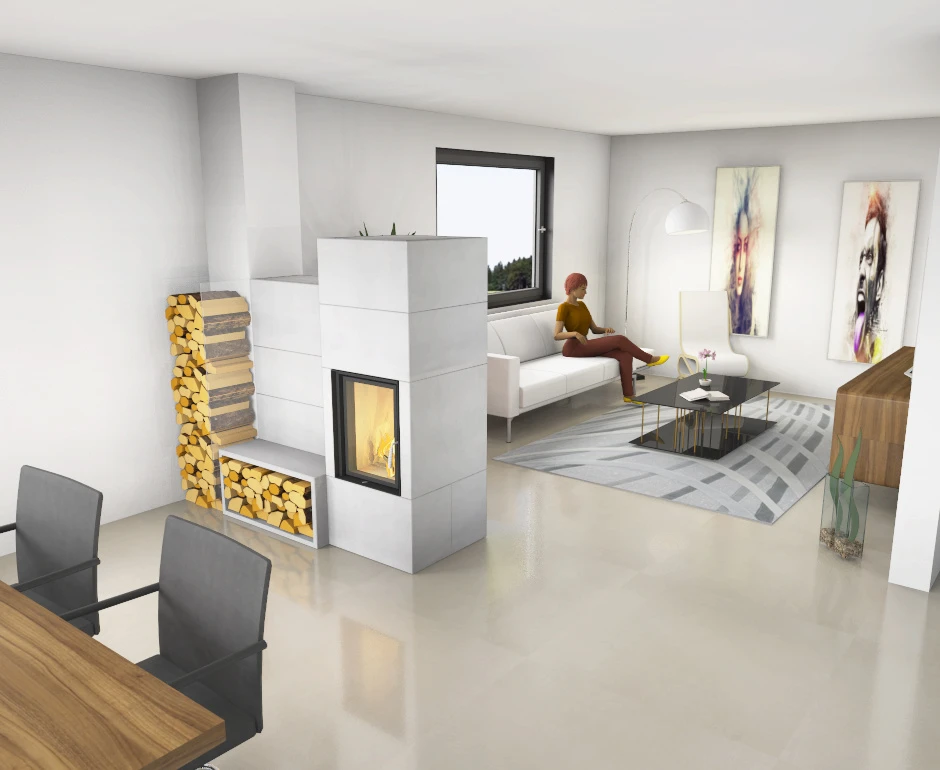 Mit Putz, Farbe oder Keramik kann die Oberfläche aber auch nach individuellen Wünschen der Raumsituation angepasst werden. Je nach Geschmack können Sie Ihren Speicherofen BSO 03 mit HKD 2.2 DF Kachelofeneinsatz und EAS farblich mit der bestehenden Umgebung verschmelzen lassen oder ihn optisch von dieser abheben.